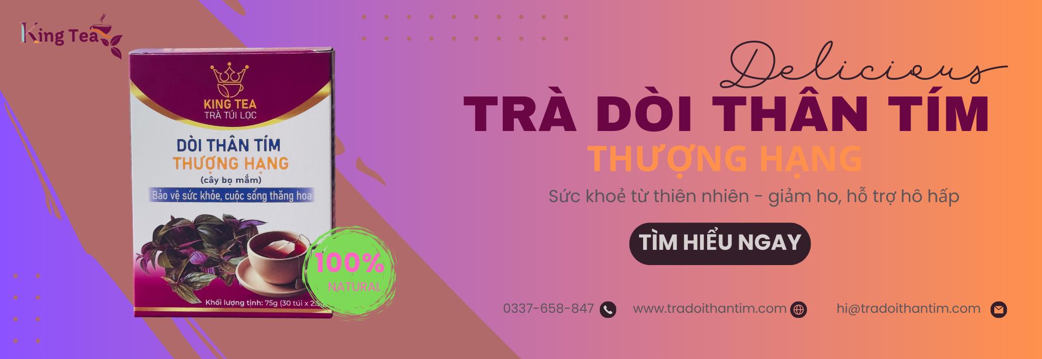 King Tea tự hào là thương hiệu tiên phong mang trà dòi thân tím, tinh hoa từ thiên nhiên Việt, đến mọi gia đình”